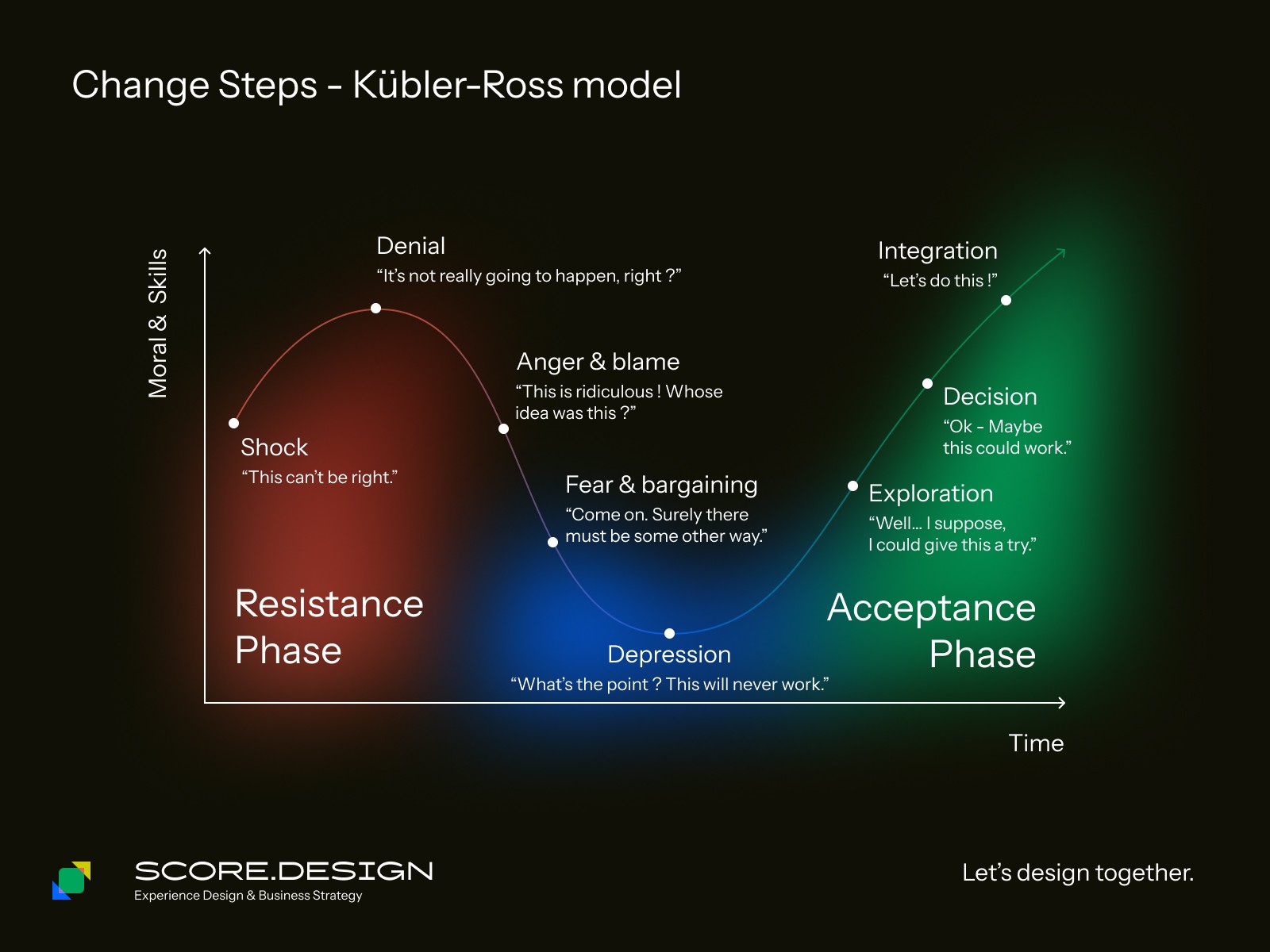 In 1969, psychiatrist Kubler-Ross invented this model, which provides a reading of the different phases we go through when mourning or experiencing a sudden event that triggers emotions. It can be transposed to our lives and professional projects, especially when a new parameter comes along and calls the system into question.