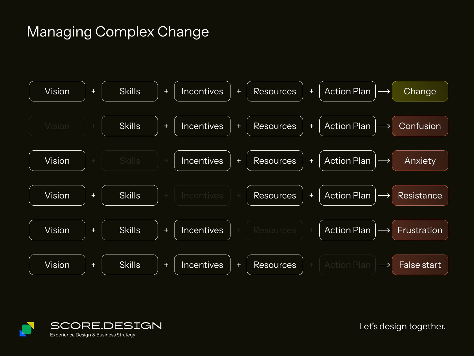 Here are the 5 key ingredients for change. Remove one and see what effect it has. The importance of a shared vision, of staying in the flow state, of having the means, the rewards and a clear plan of action. Anything nebulous is a recipe for failure.