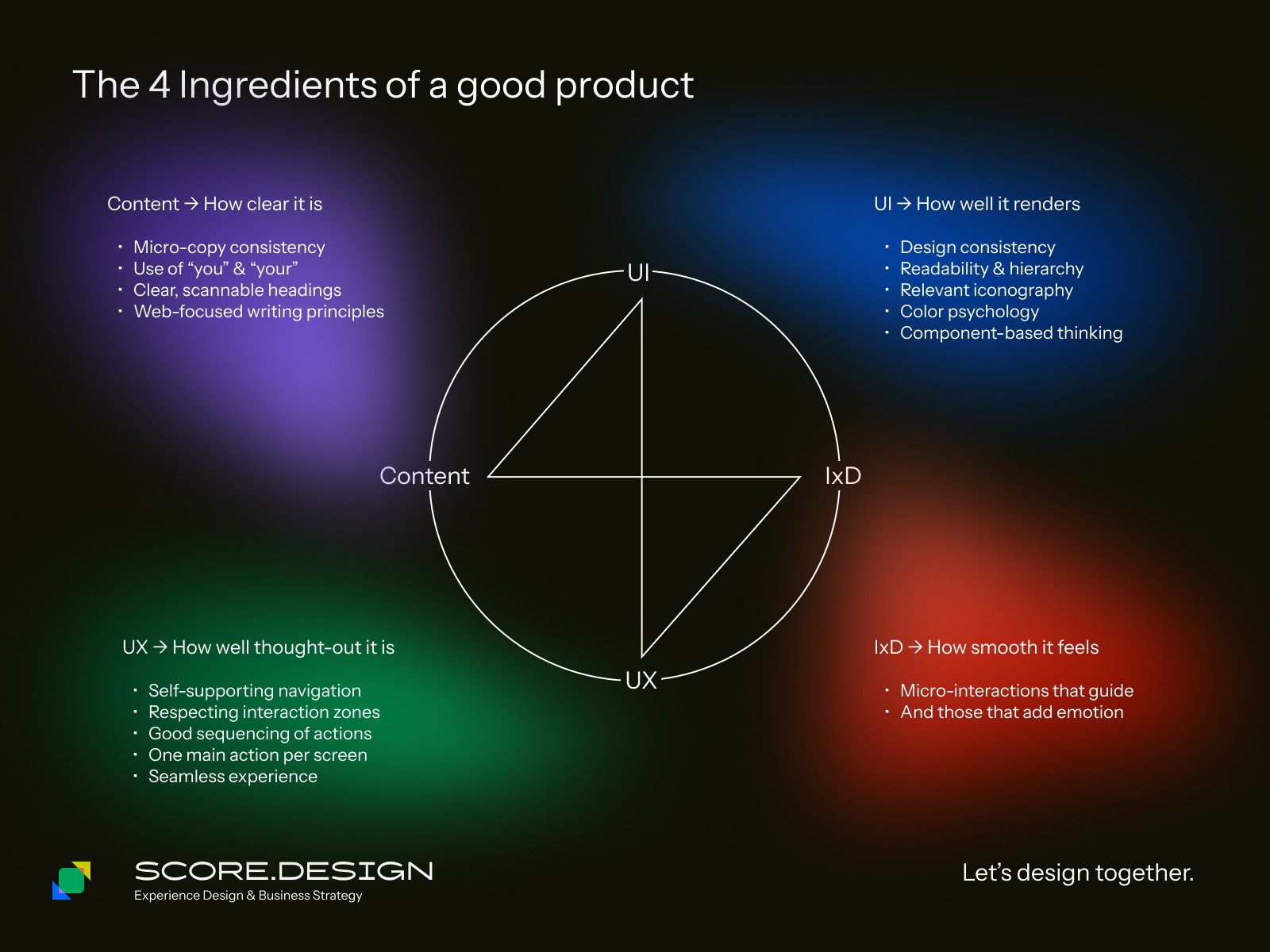 What makes a good product? For a number of years now, to simplify and speed up the analysis and improvement of a product, I've been using this 4-point approach. content: how clear it is. UI: how well it renders. UX: how well thought-out it is. And finally the interactions: how smooth they make things. The sub-points provide a more detailed analysis. And quickly, when it comes to getting things back on track and coming up with a new design, we already know where to start.
