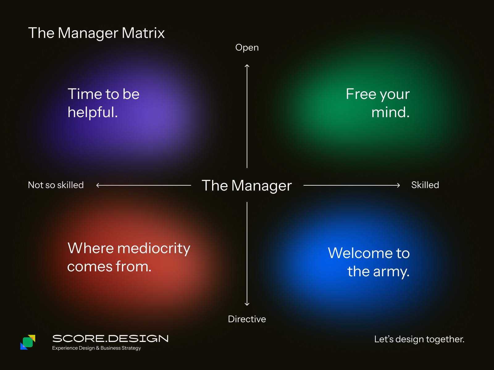 A useful schema for understanding certain opportunities and pitfalls. Sometimes one wonders why the experience is broken. One of the causes may be stubbornness or ignorance of the right priorities to have. So we need to find ways to act on the axes. Make the directive more open. Infuse design skills and culture at all levels.