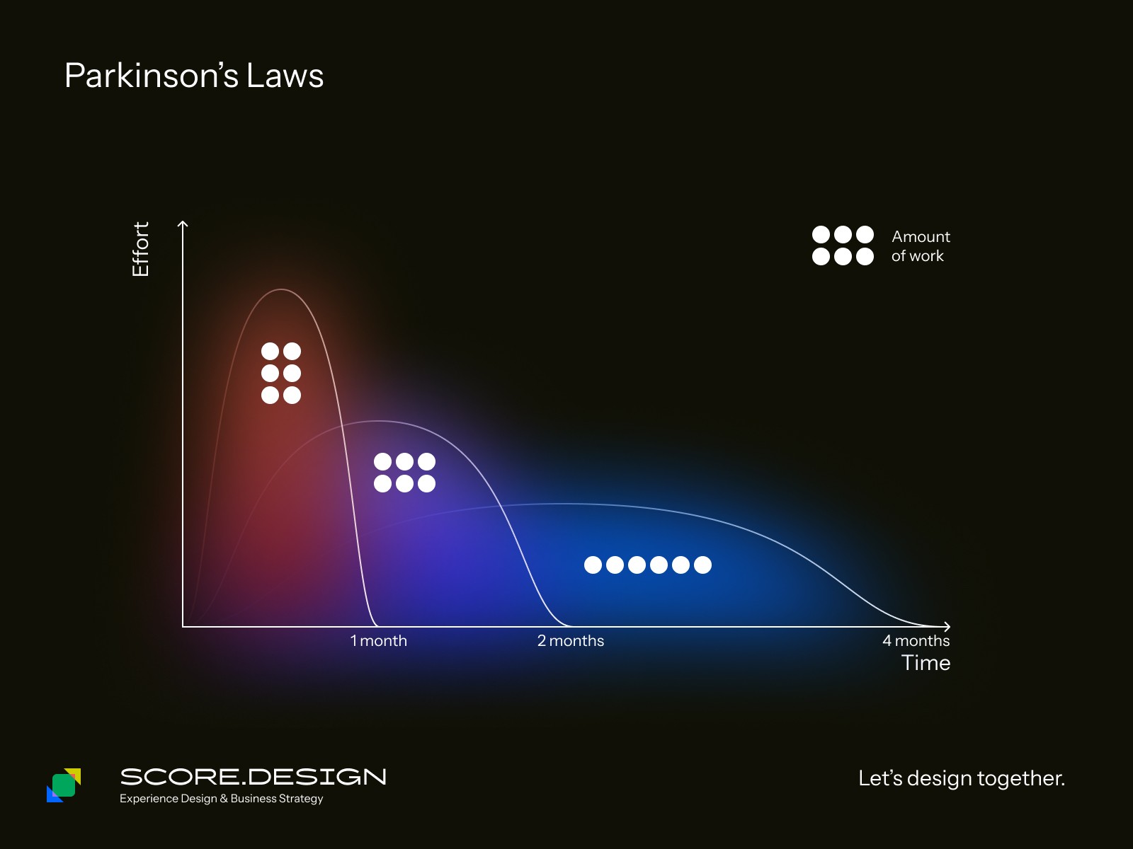 In 1955, Cyril Northcote Parkinson created his laws which highlight the fact that a job will expand according to the time it is given. By assigning the right amount of time to a task, we minimize complexity and proscratination to gain back time. Deadlines are motivating. More time = less effort required. Less time = more effort required. That's why, with the right skills, pragmatism and experience, it's important to size the phases of a project accurately and precisely.